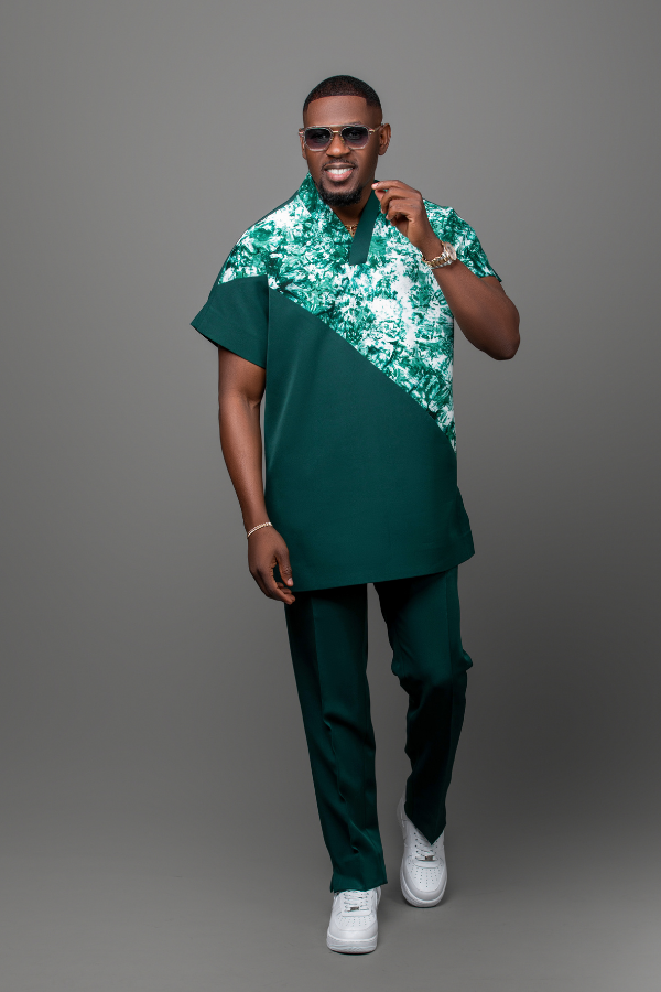 The Emerald Royale Kaftan Set is a modern expression of African elegance and confidence. Designed with a rich deep-green base and a striking patterned panel across the upper body, this outfit blends traditional inspiration with contemporary luxury.